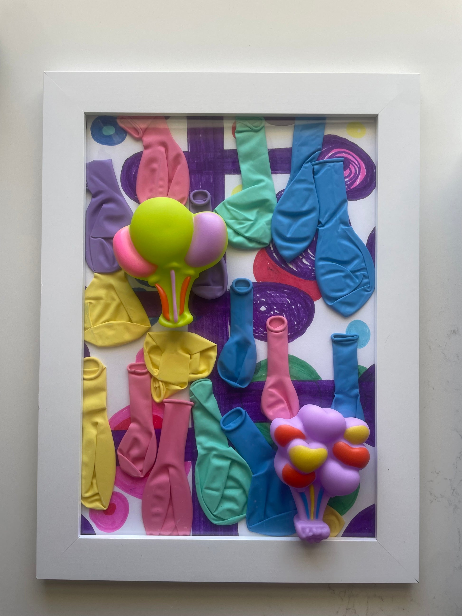 Balloons and permanent marker on 250 gsm paper. Framed and ready to hang.